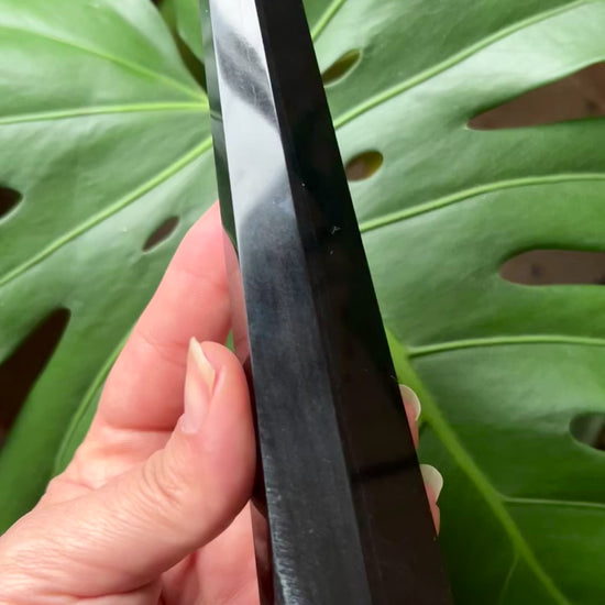 Natural flashy blue tiger’s eye obelisk tower. It stands 7.5 inches tall, its 1.5 inches wide and has a 1.25 inch base.
