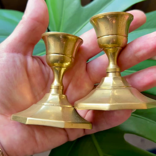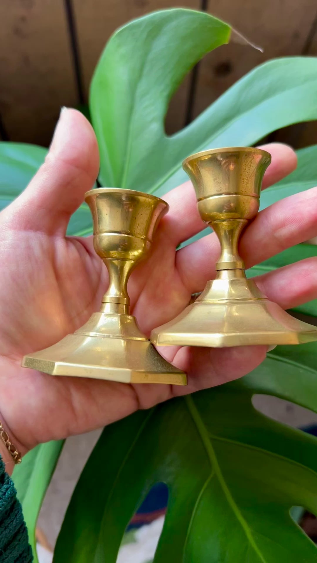 Vintage brass candlestick holder set of two. These are for taper candles. They measure 2.6 inches tall and the base measures 2.4 inches across. Made in India, slight polishing is needed.