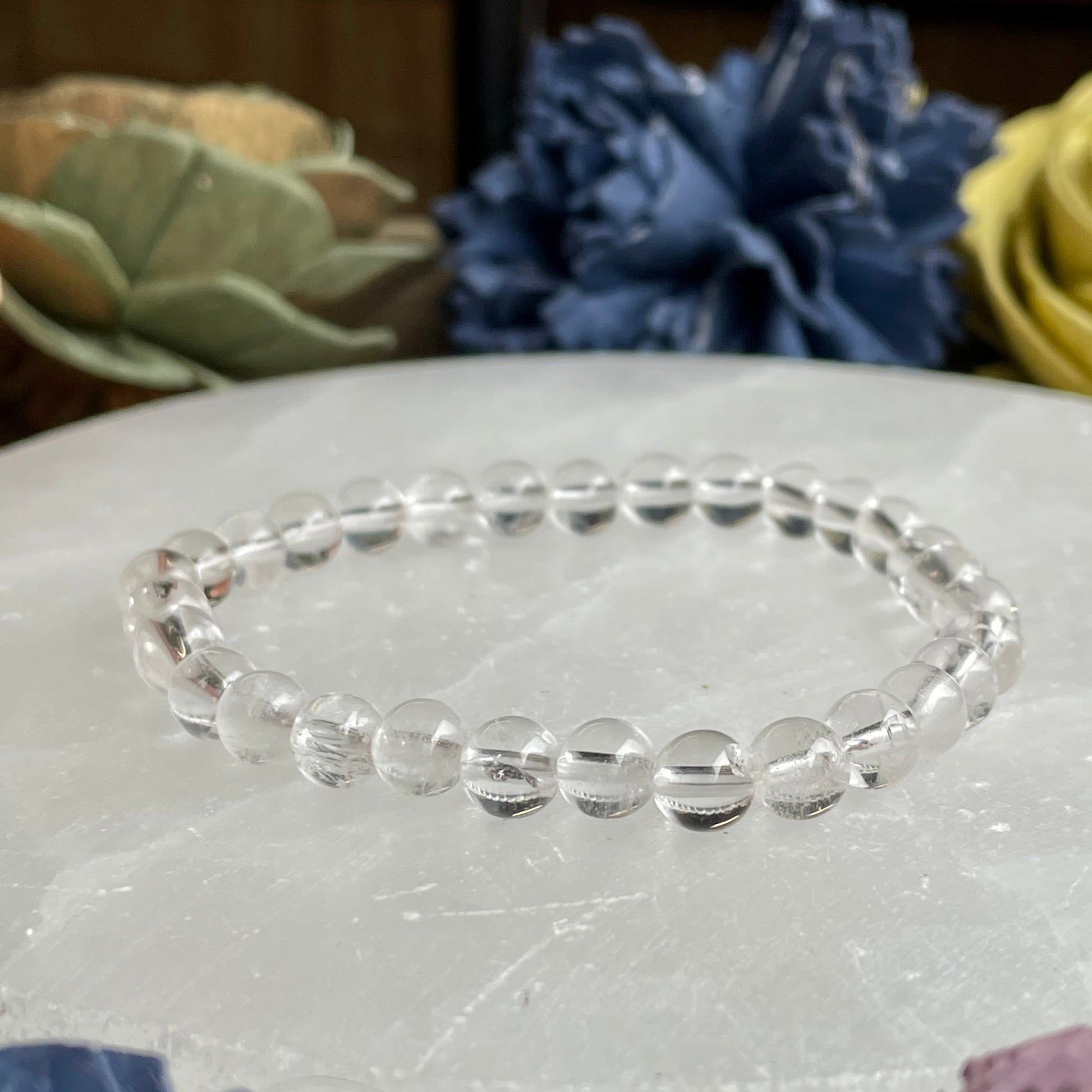 You will receive one natural clear quartz beaded bracelet! These are made with 6mm round beads and strong elastic that stretch over your hand to fit.