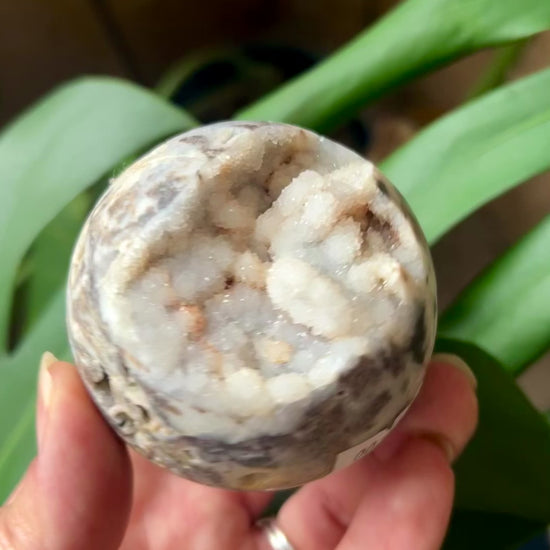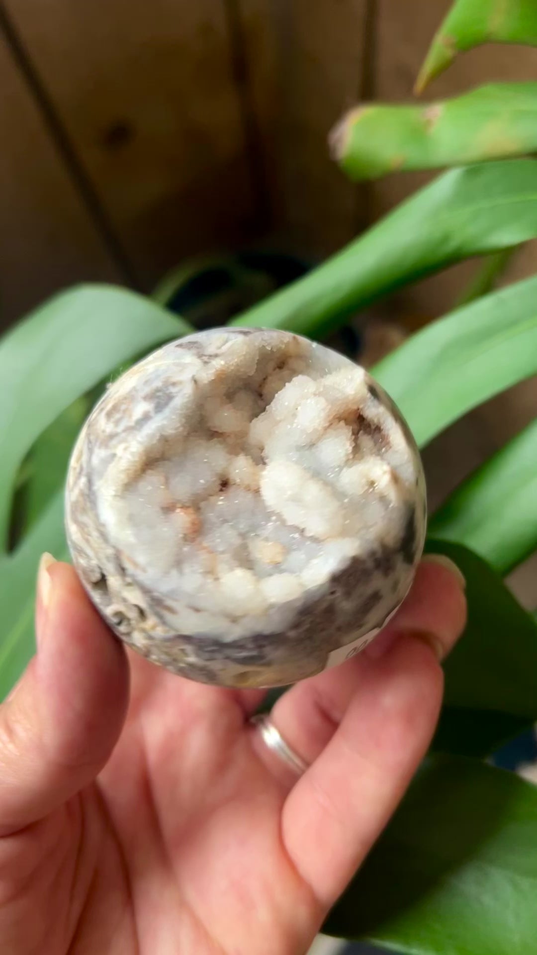 Natural sphalerite sphere with druzy pockets. This sphere weighs 10.9 oz and measures 2.6 inches across in diameter. Comes with free sphere stand.