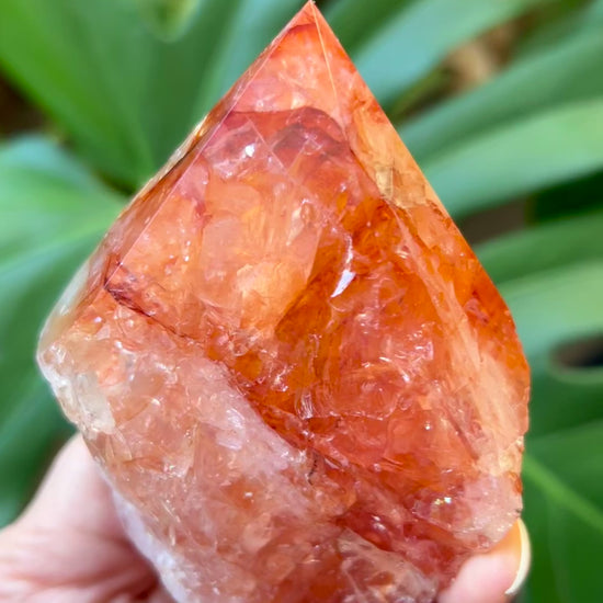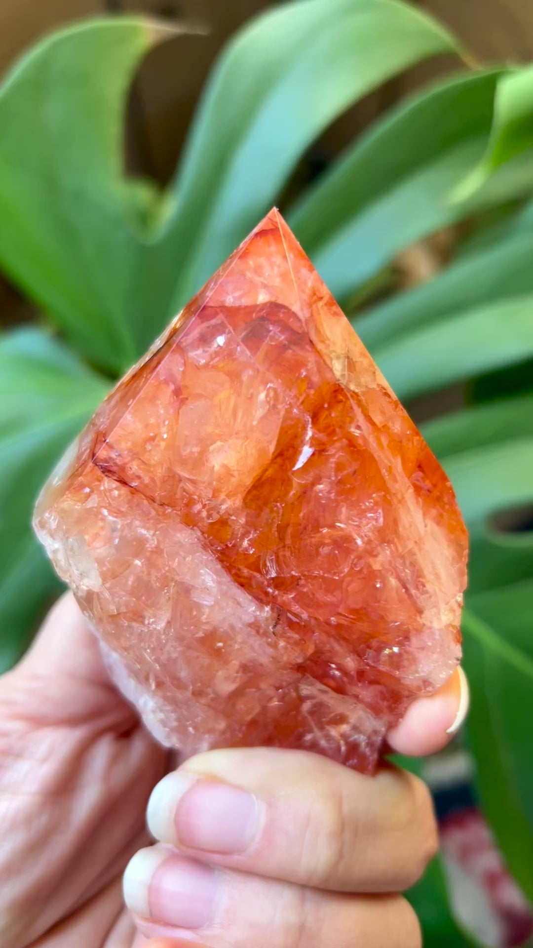 This beautiful gemmy fire quartz (hematoid quartz) specimen features a unique combination of natural half-polished and half-raw surfaces. Weighing 9.2 oz, its dimensions are 3.25 inches in height, 2.75 inches in length, and 1.75 inches in width.