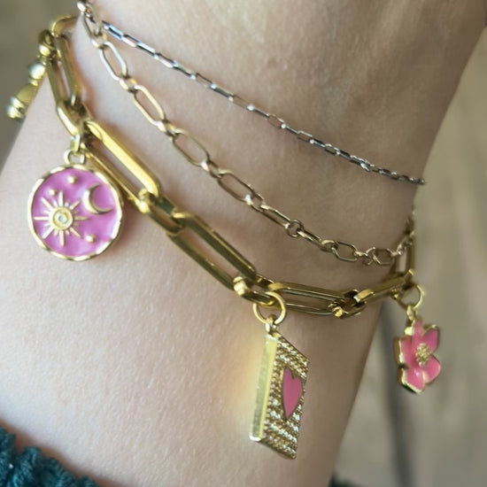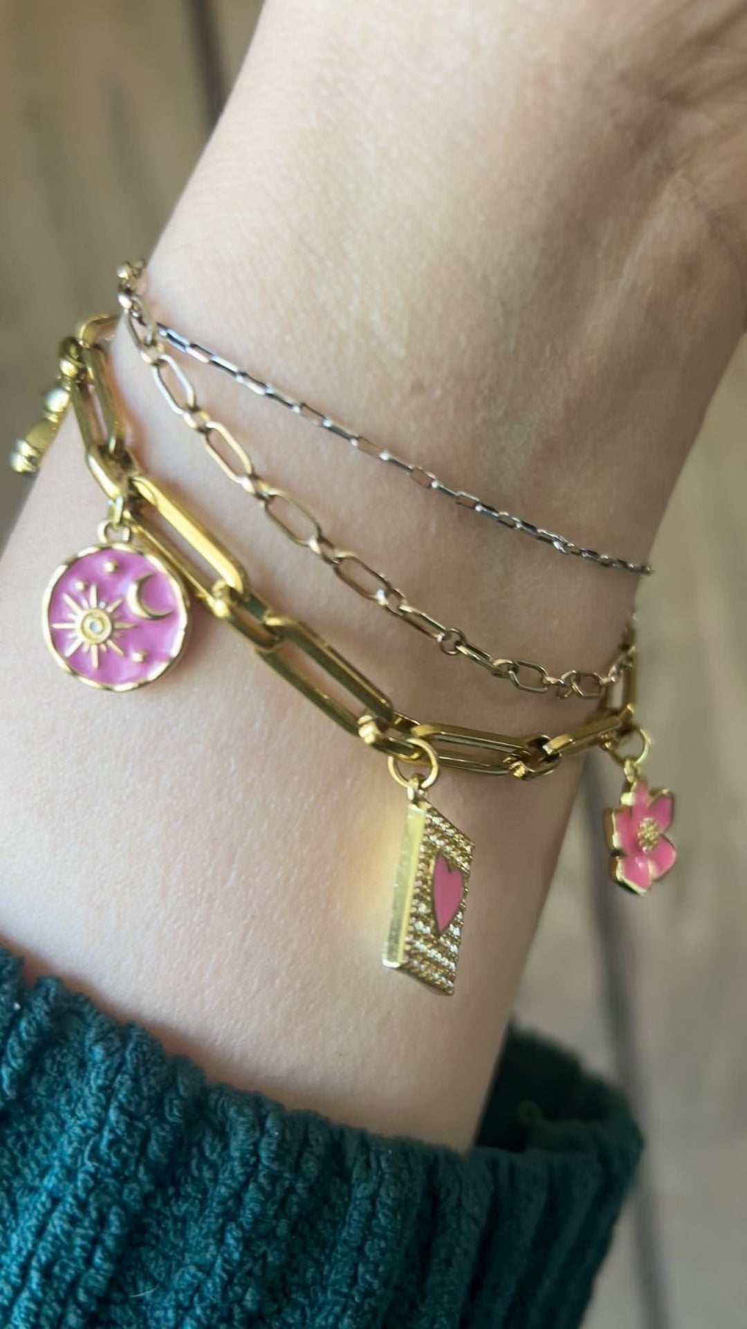 18k gold plated stainless steel paperclip chain bracelet with lobster clasp, adjustable length from 8’ - 9’ inches. All charms 18k gold plated over brass with pink enamel detail. Very cute bracelet!
