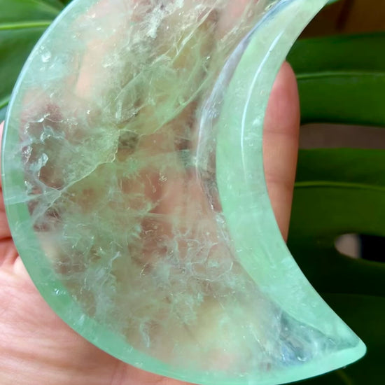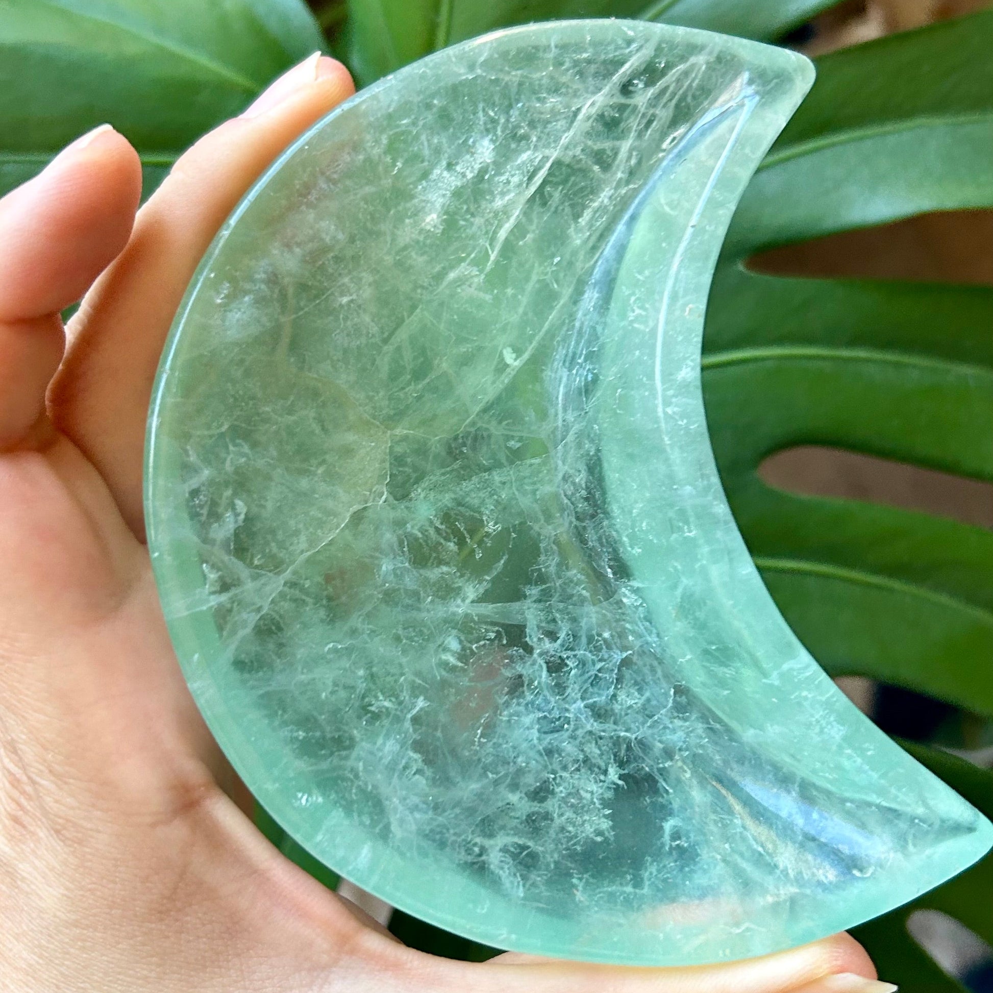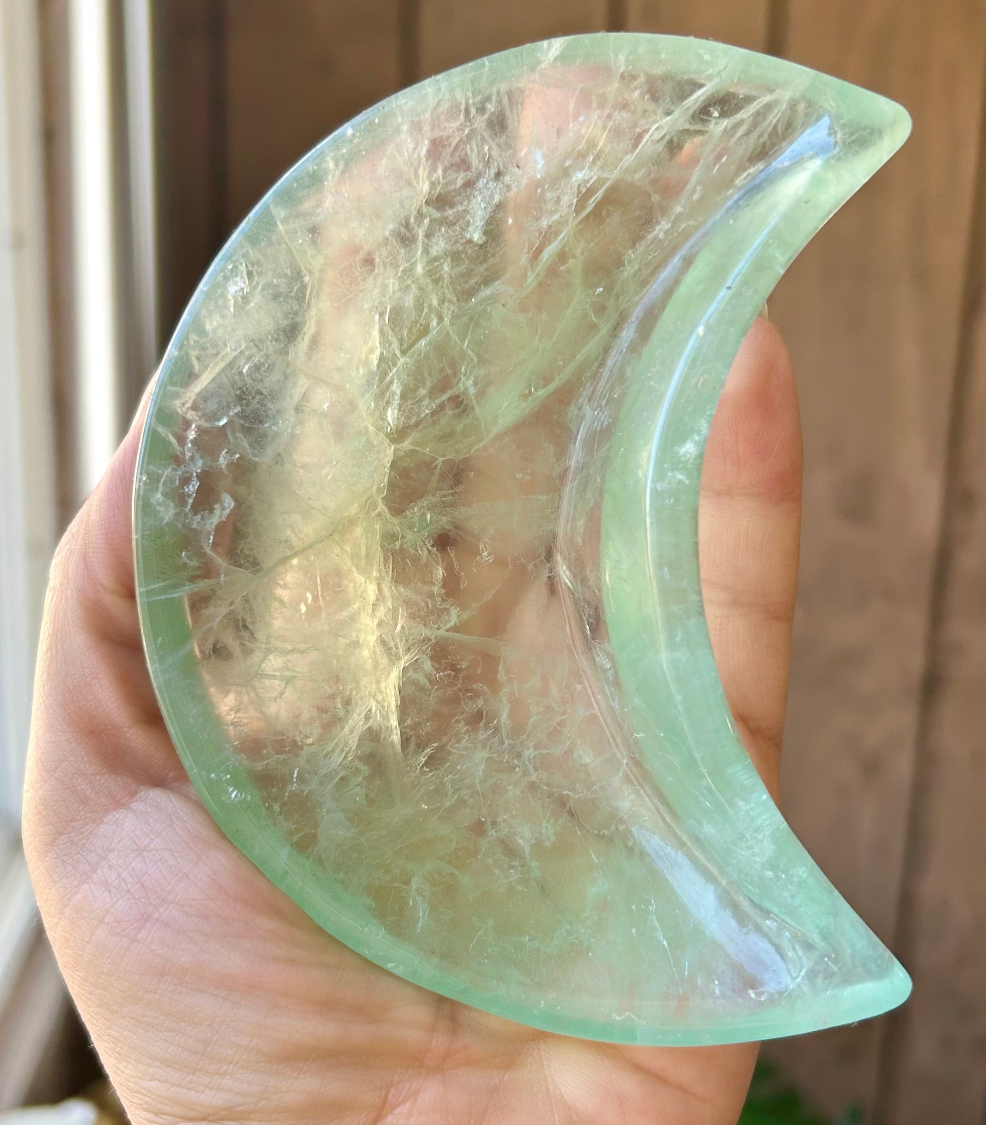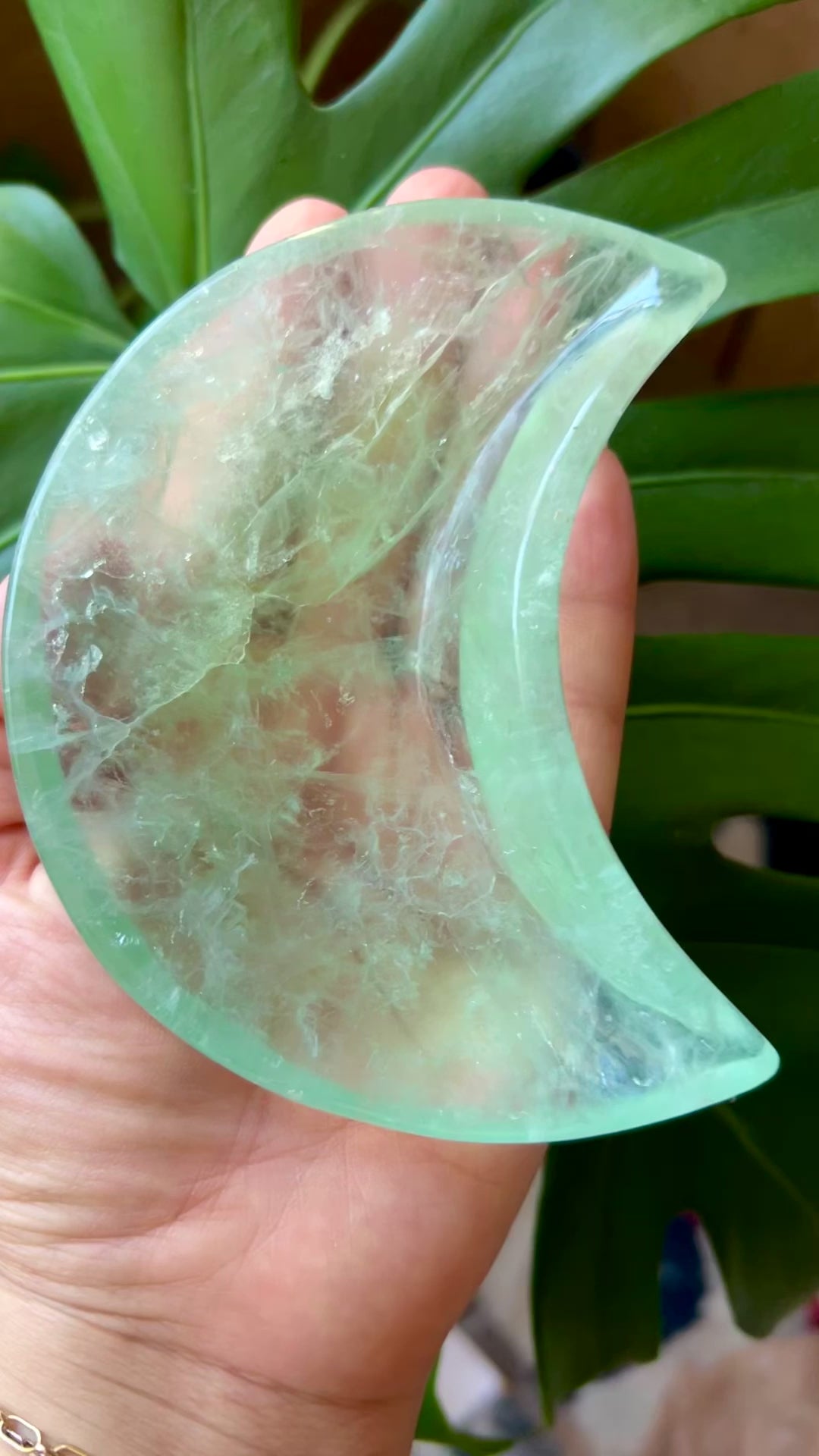 Lovely green fluorite moon shaped bowl, perfect for jewelry, stones and trinkets. It weighs 11.8 oz and is 4.75 long, 3.5 wide, with 1 inch depth.