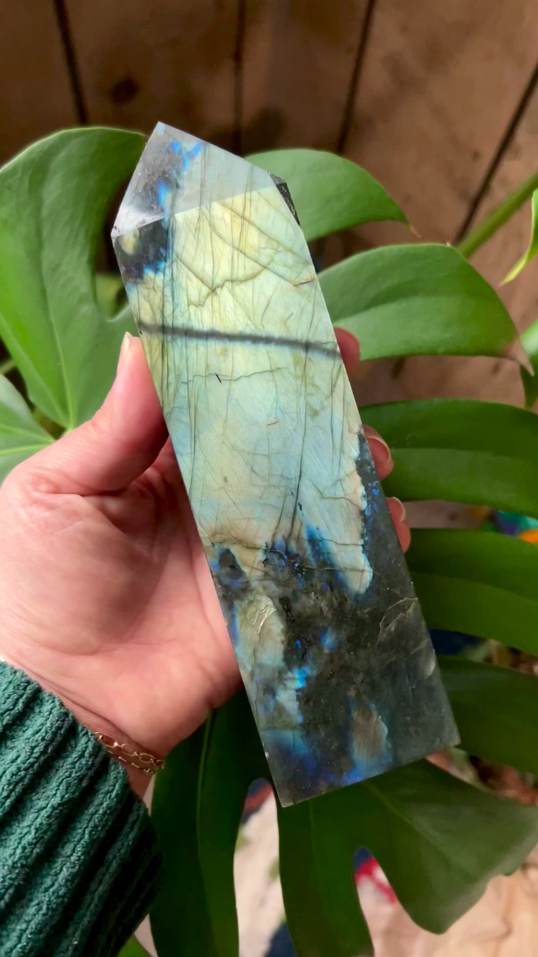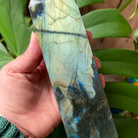 Flashy x-large natural labradorite tower. Weighing 1 lb and 15.2 oz, it stands 7.5 inches tall, 2.1 inches wide and 1.6 inches thick.