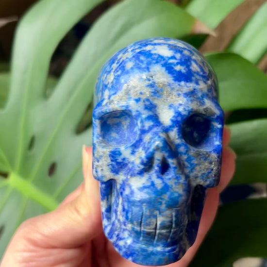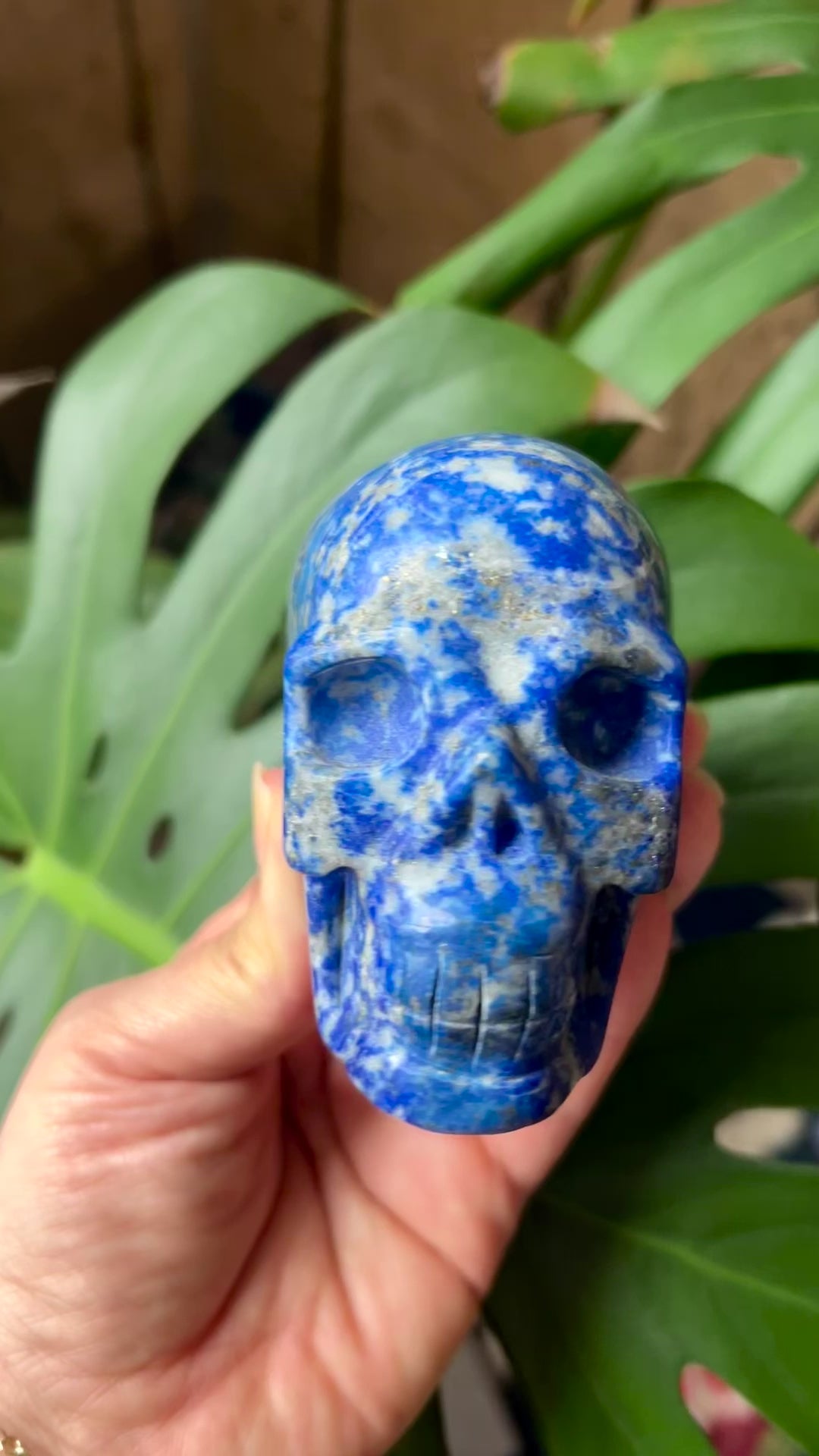 Natural lapis lazuli detailed skull carving, measuring 2.75 inches tall, 3.5 inches long and 2.25 inches. Weighs 1 lb and 7.2 oz.
