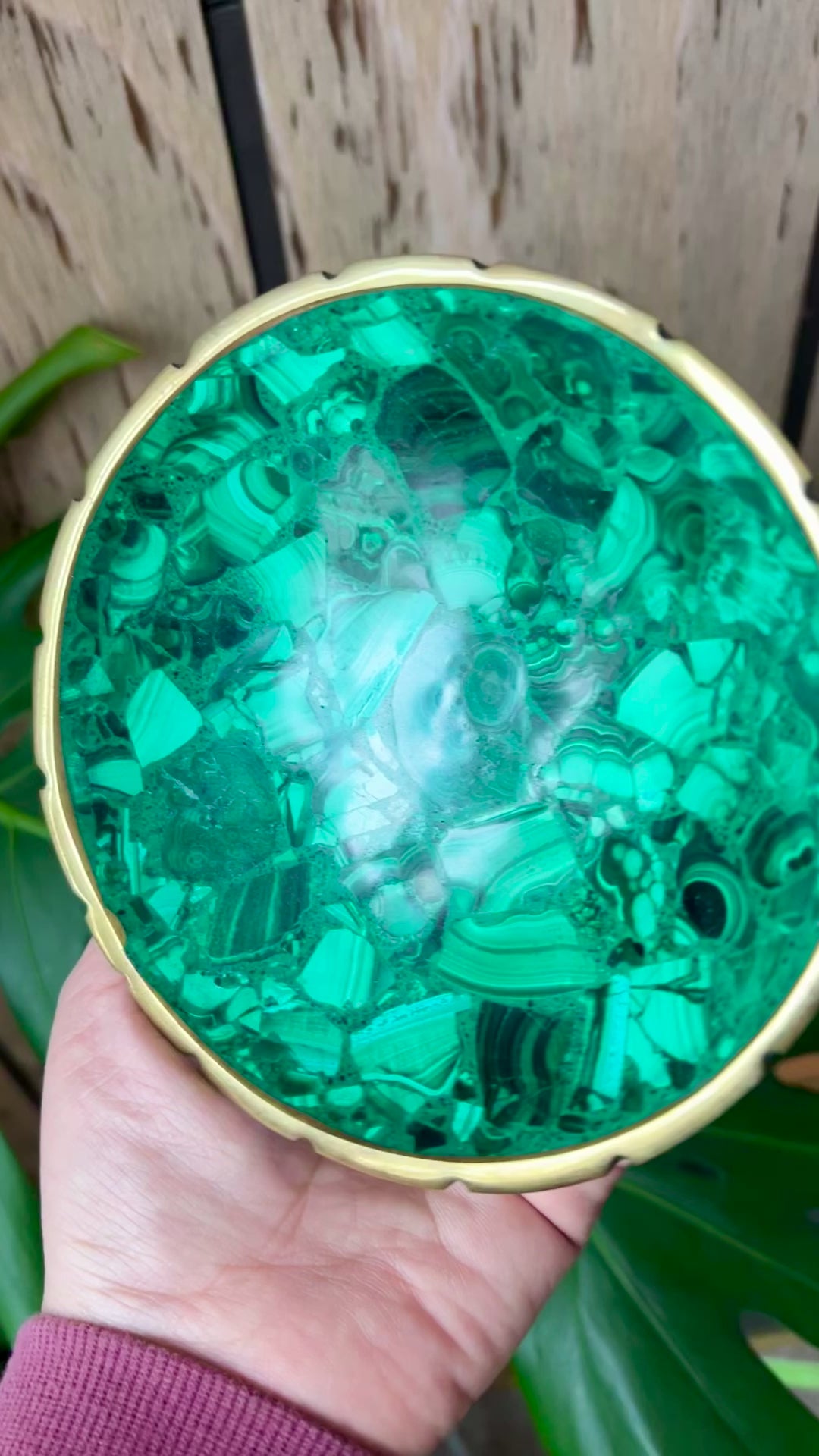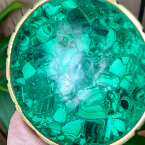 Beautiful natural malachite handmade bowl with brass rim. Measures 5.25 inches across 1 inch deep.