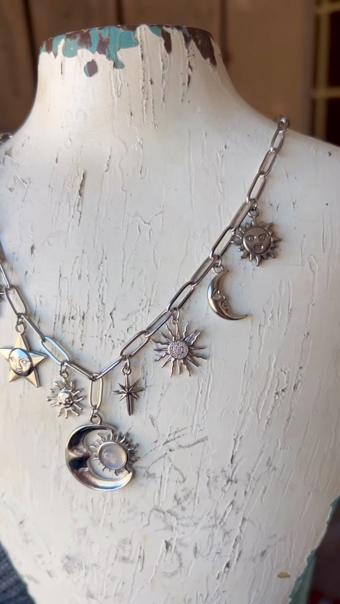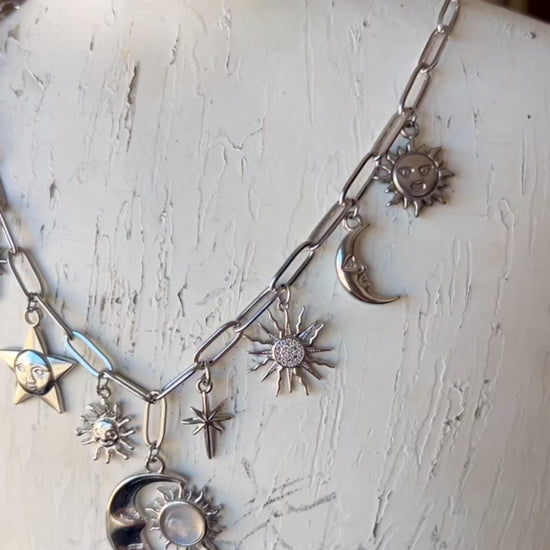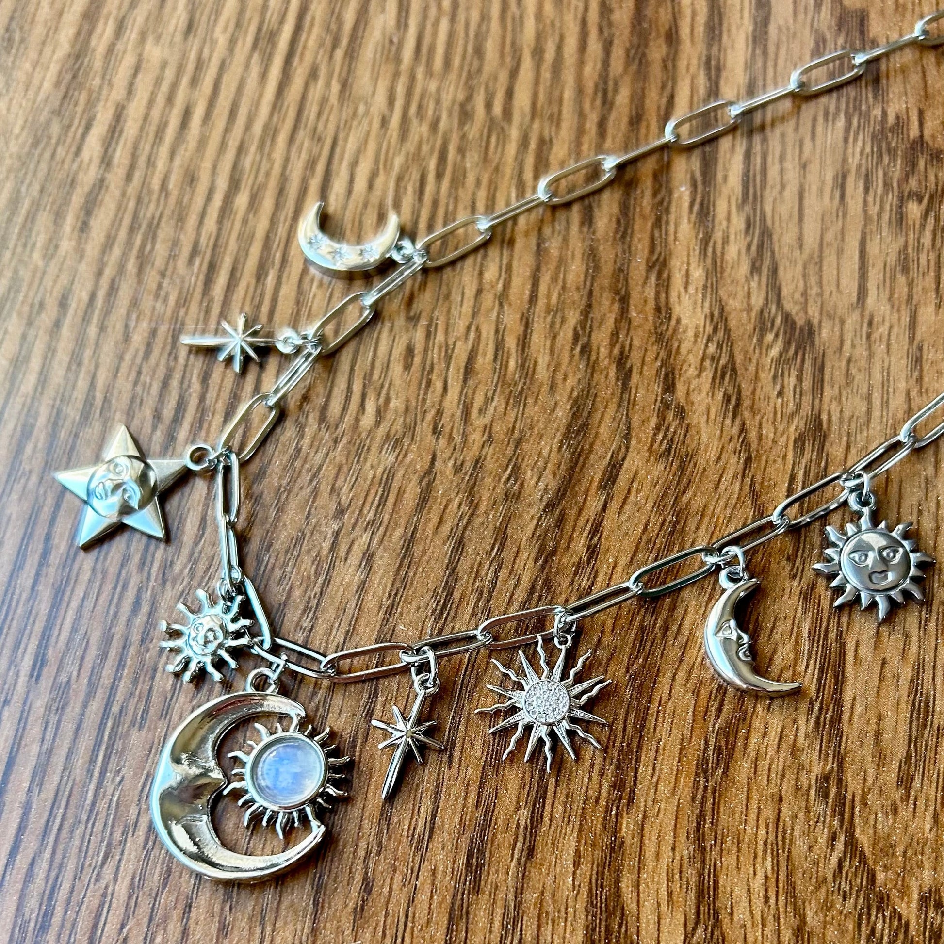 Beautiful celestial theme charm necklace with stainless steel necklace base and a natural moonstone moon/sun pendant center. Charms are a mix either stainless steel or platinum plated- both tarnish resistant.