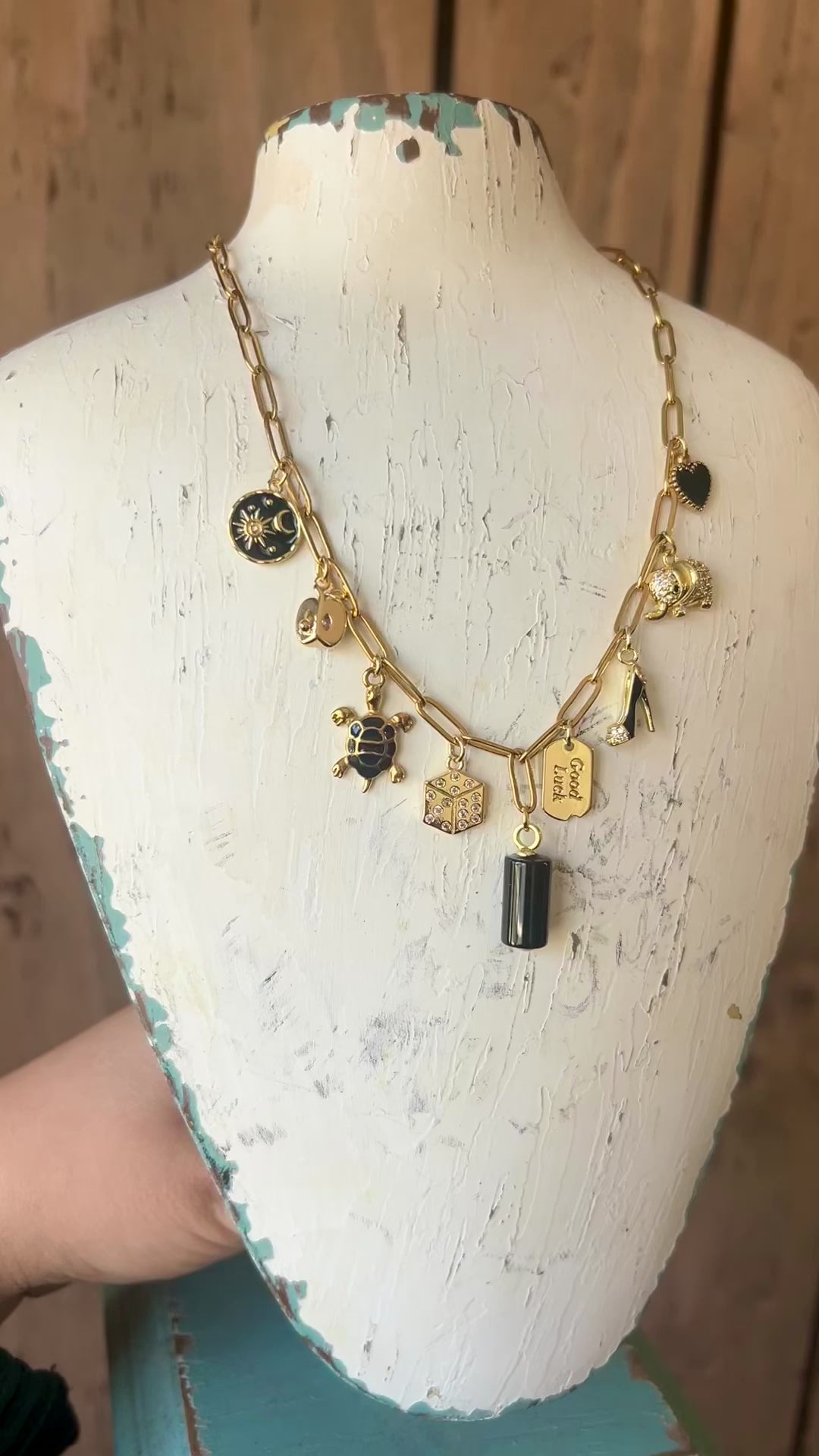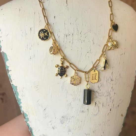 Natural black onyx pendant charm necklace with 18k gold plated charms.