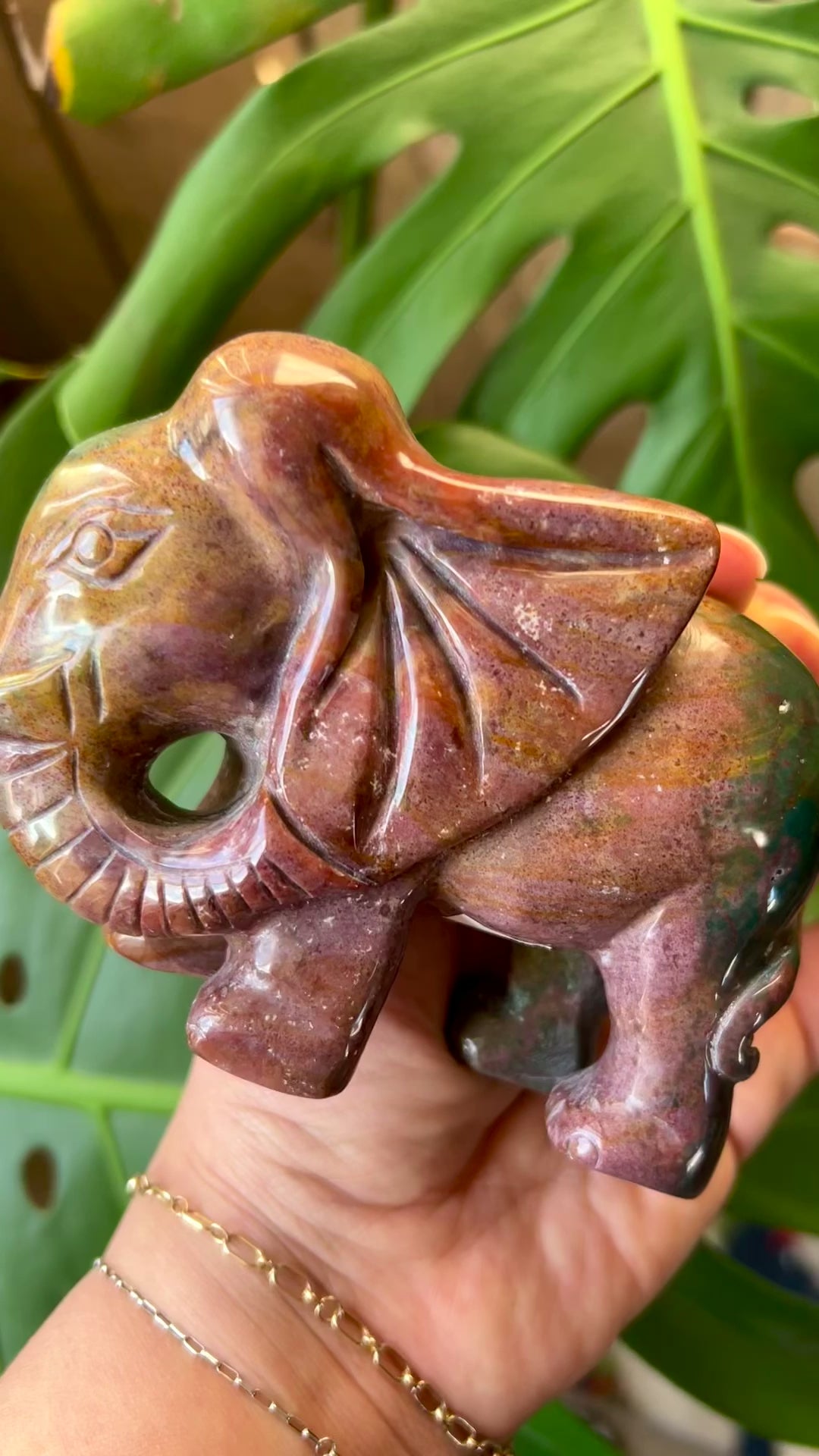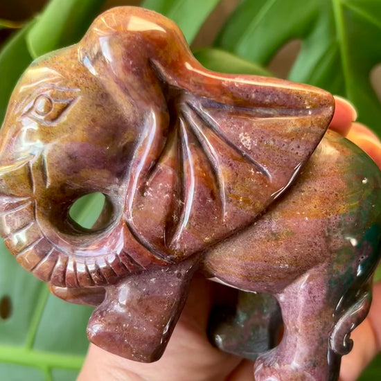 This elephant carving is crafted from authentic ocean jasper, weighing 1 lb 4.2 oz, with dimensions of 4.5 inches in length, 3.25 inches in height, and 2 inches in width.
