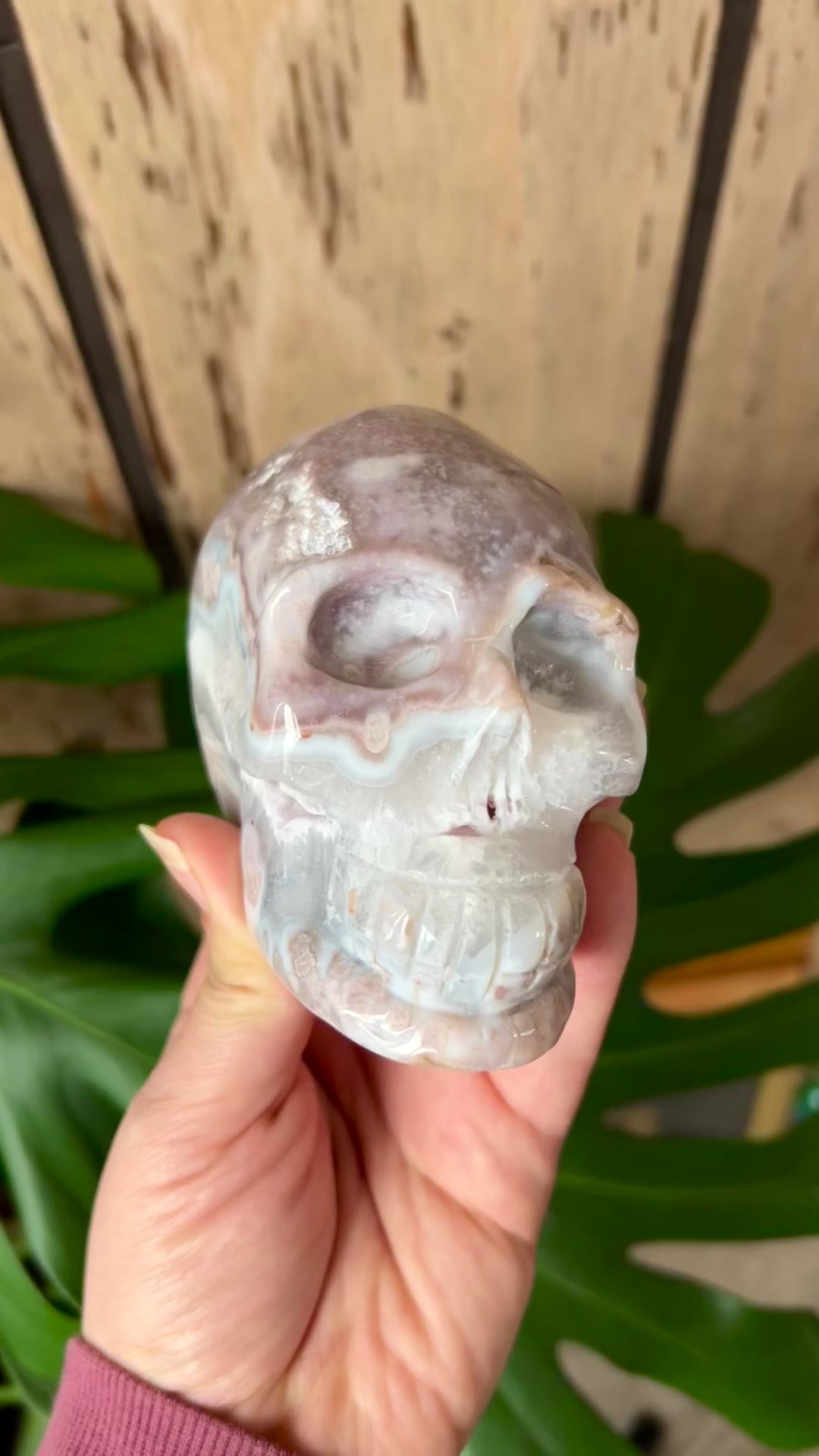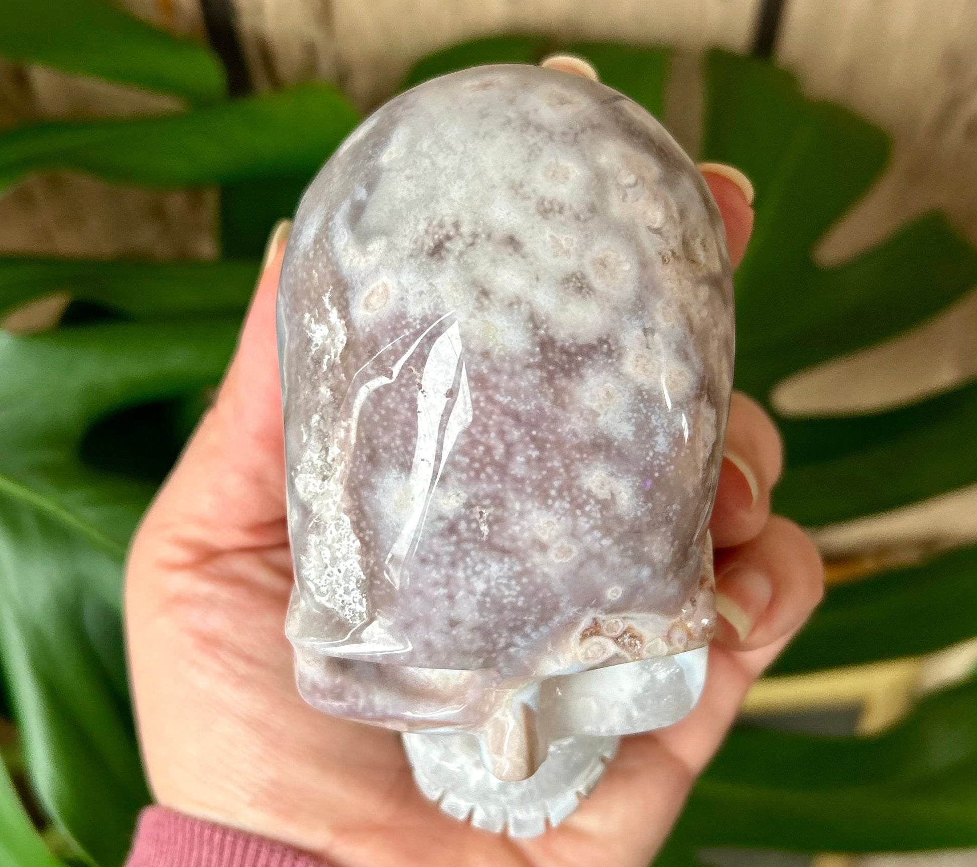 Natural Pink Amethyst and Flower agate mix skull carving with beautiful druzy pockets. It measures 3.25 x 4 x 2.25 inches and weighs 1 lb and 11.4 oz.