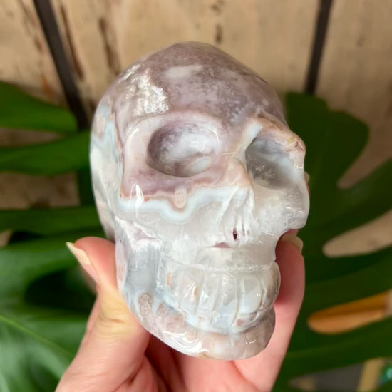 Pink Amethyst Flower Agate Skull Carving