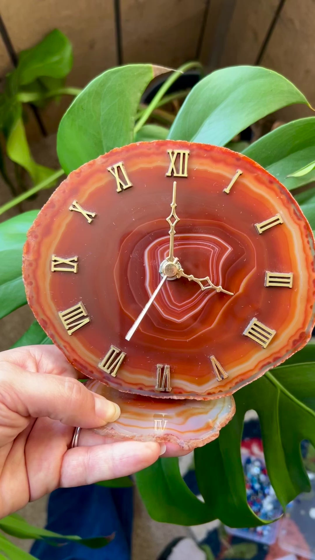 Natural Red Agate slice clock with roman numeral numbers. It's on a metal stand connected to another agate slice. Clock works and has a very soundly "tik tok" sound! Works on 1 AA battery, will throw in a battery for free.