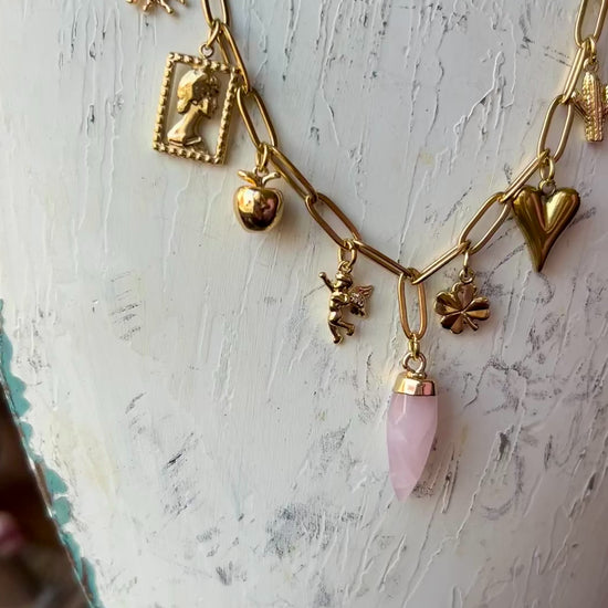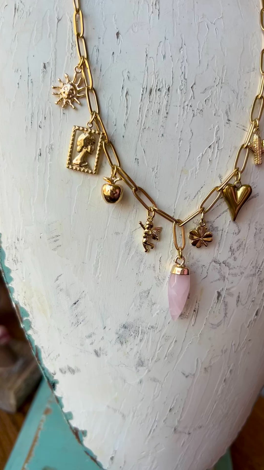 Natural rose quartz pendant charm necklace with 18k gold plated charms.