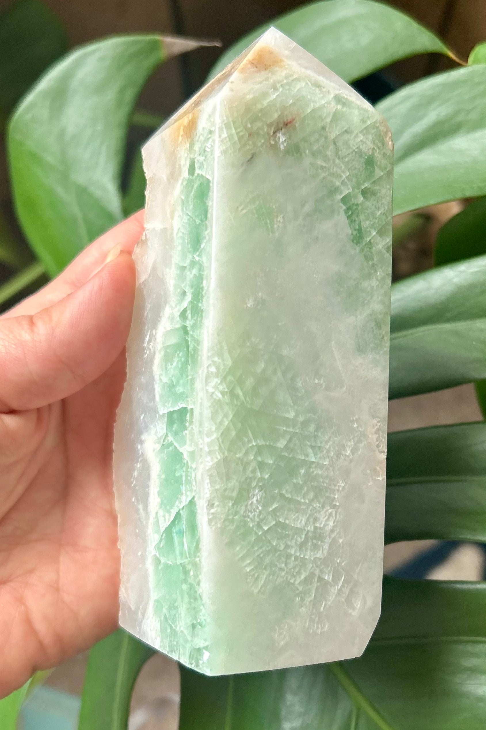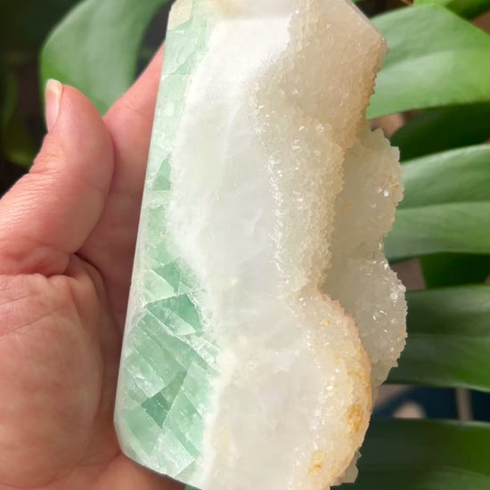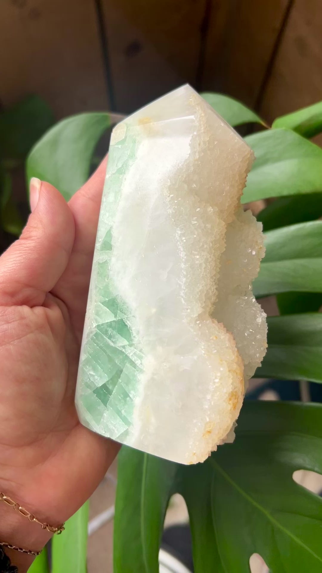 Natural sugar druzy Quartz and fluorite Tower, weighing 1 lb and 11.4 oz, measures 5.5 inches tall, 2.25 inches long and 1.75 inches wide.
