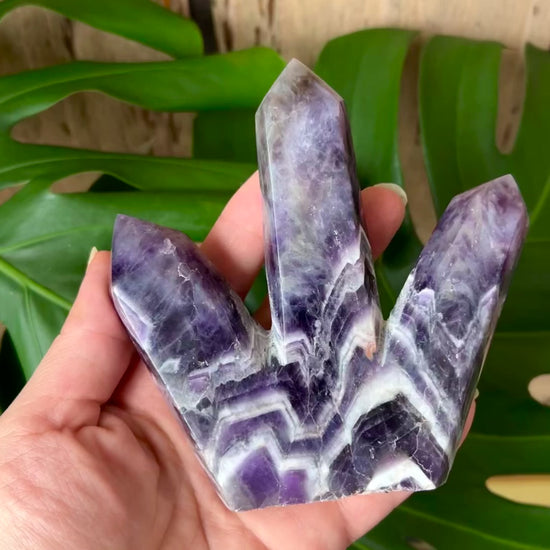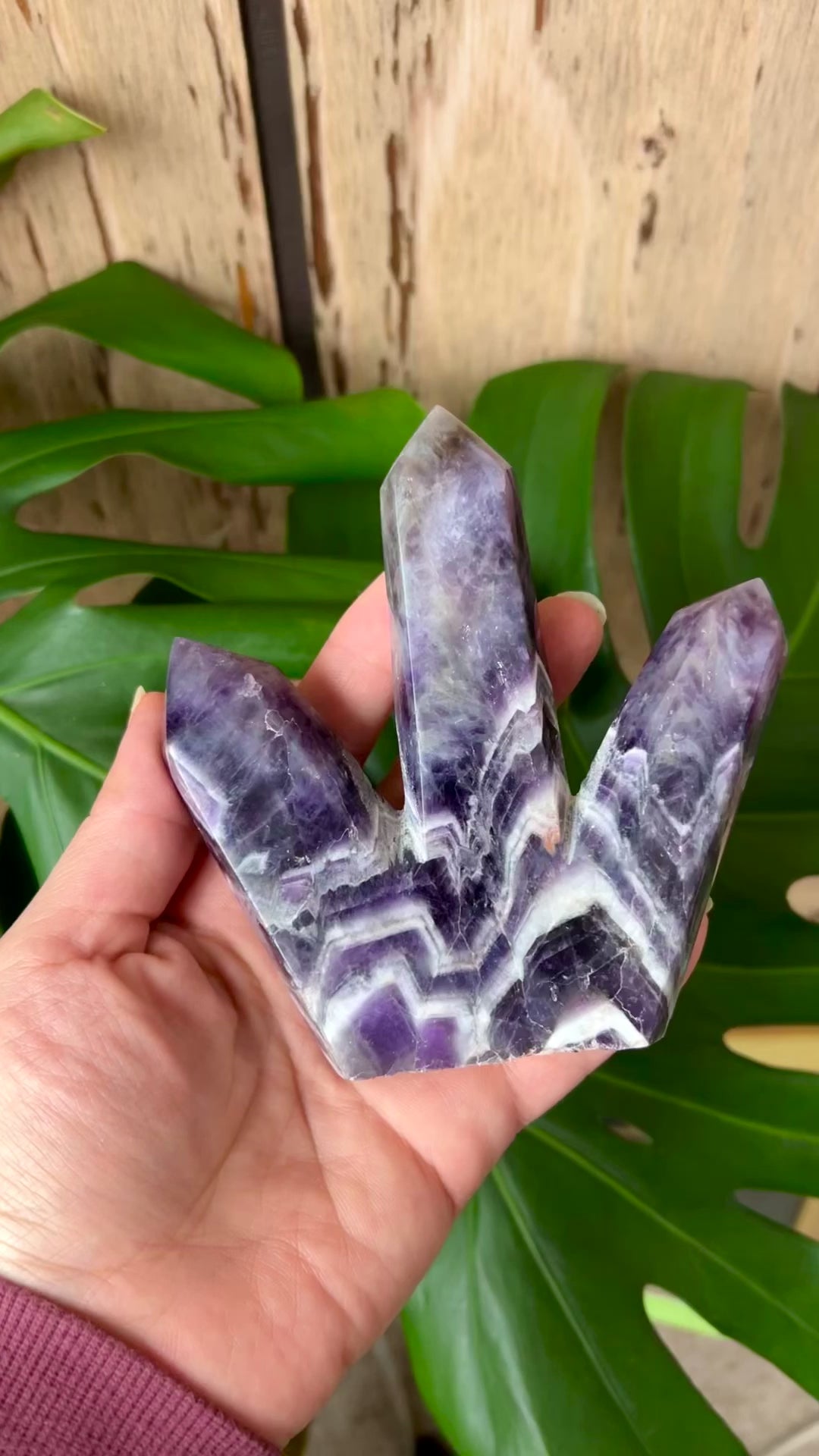 Natural chevron amethyst triple point tower. This unique tower has three points measuring 4.75 inches tall and 4.5 inches at its widest point, weighing 14 oz.