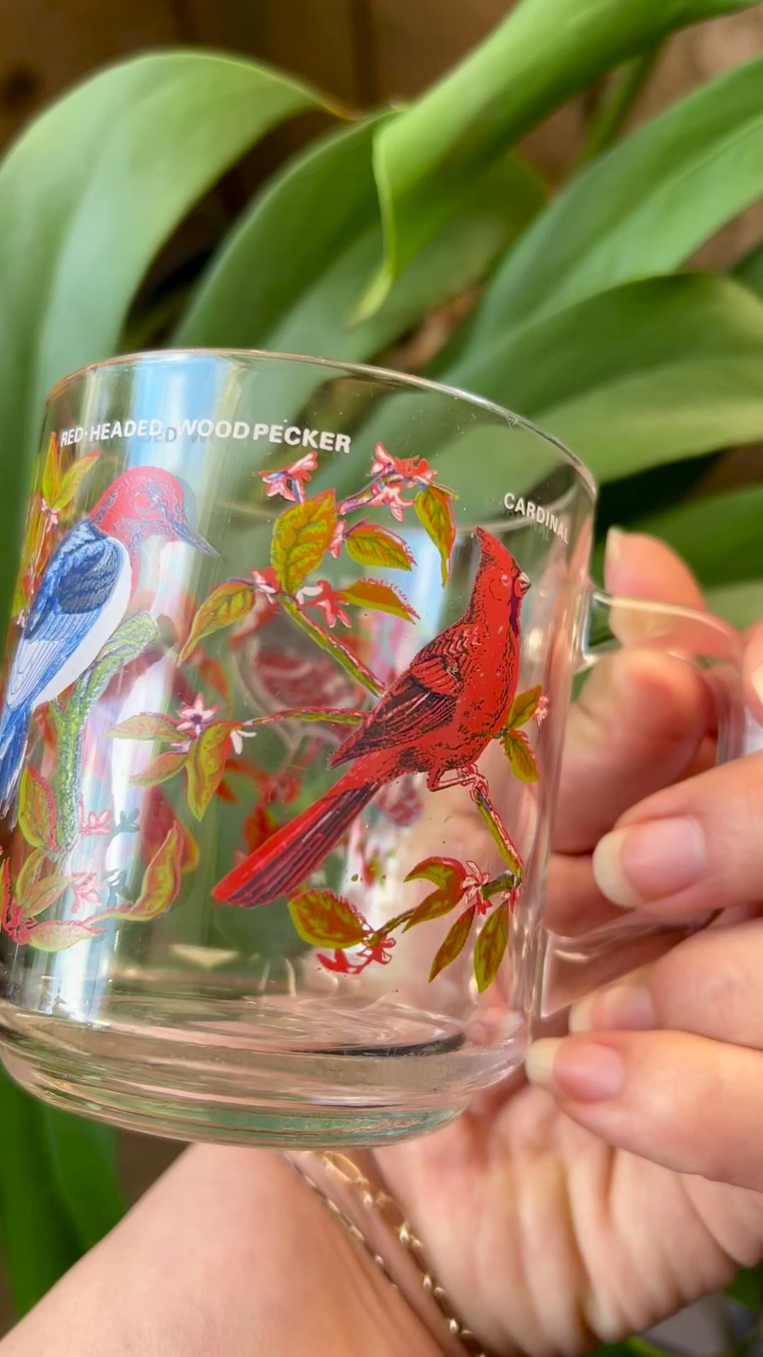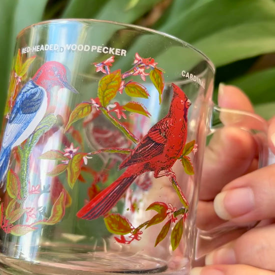 The mug features a pattern of birds, specifically a blue jay, cardinal, oriole, and a red-headed woodpecker.