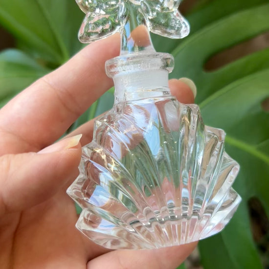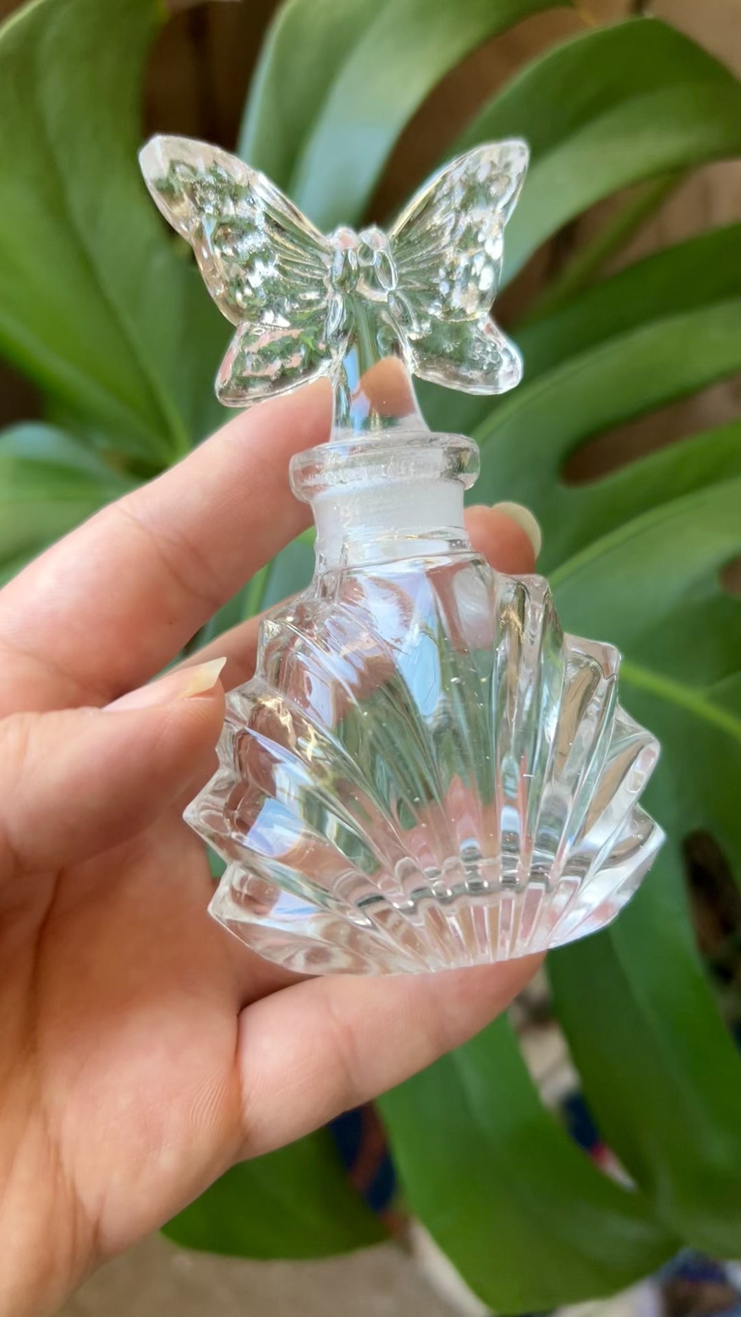Vintage art deco style perfume bottle with butterfly stopper. It measures 4.25 inches tall with stopper.